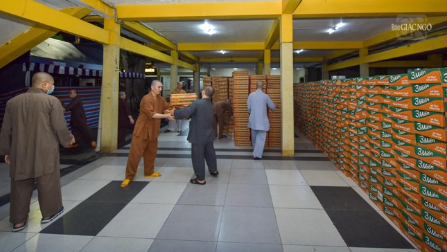 Các thành viên của Ban Kinh tế – Tài chính T.Ư, Ban Từ thiện xã hội GHPGVN TP.HCM cũng như chư Tăng chùa Vĩnh Nghiêm sắp xếp các thùng mì lên xe