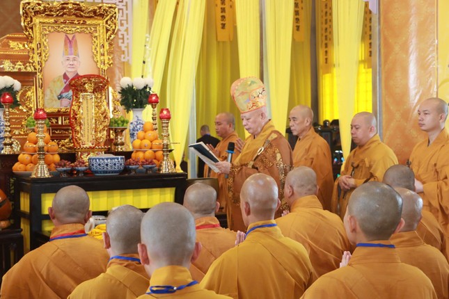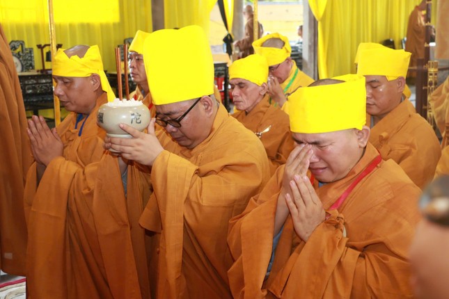 Sau đó, Hòa thượng Thích Lệ Trang sám chủ buổi lễ cùng chư tôn đức Ban Kinh sư đã thực hiện nghi thức cung thỉnh Giác linh an vị và thành phục, phát tang.